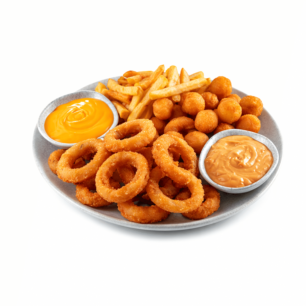Картофельные шарики, луковые кольца, картофель фри, соус бургер, крем-сыр чеддер.