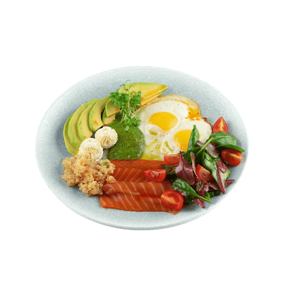 Обжаренные яйца с авокадо, крем-сыром, киноа, сёмгой, миксом салата и черри. Заправлено соевым и оливковым маслом, подаётся с пшеничной булкой и ароматным маслом